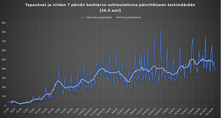 Jostain syystä testien määrä on ollut noin viikon laskusuunnassa, ja tästä johtuu suurelta osin myös tapausten määrän merkittävä lasku. Testimääriin suhteutetussa kuvaajassa ei ole merkittävää laskua vielä, vaikka odotan tämänkin kyllä tapahtuvan lähiviikkoina. Tulee olemaan mielenkiintoista nähdä, että tapahtuuko hallituksen suunnalla herääminen liikkumisrajoituslain tarpeettomuuteen, vai onko virheen myöntäminen liian kova pala, Toistaiseksi virheitä ei ole myönnetty yhtäkään, vaan syyttelevä sormi on aina liikahtanut esimerkiksi THL:än, STM:än, aluehallintovirastojen, opposition tai kuntien suuntaan. Ehkä sopivin syyllinen tässä tapauksessa tulee olemaan THL ”laskuharjoituksineen”.