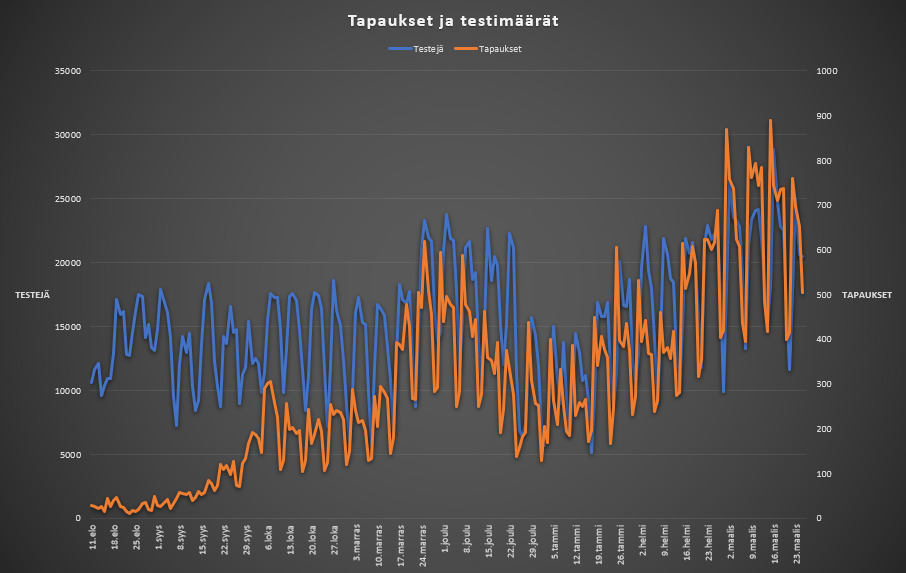 Testimääriin suhteuttamatta jättäminen on taas mielestäni paljon suurempi synti kuin pelkkä liian pitkän keskiarvon käyttäminen. Liian pitkä keskiarvo sentään kuvaa todellisuutta, mutta se tekee sen vain viiveellä. Testimäärien huomiotta jättäminen taas voi johtaa suoranaisesti harhaan. Otetaan yksinkertaisena tilanteena esimerkki, jossakin maassa on keskimäärin 500 koronatapausta 10000 henkeä kohden. Jos maan väestöstä testattaisiin satunnaisotannalla 10000 henkeä, löytyisi keskimäärin 500 tapausta. Jos taas testimäärää nostettaisiin 20000 testiin, löytyisikin yhtäkkiä 1000 tapausta. Nykyuutisoinnin perusteella kaikki tuntuu perustuvan tapausmääriin, ja testimääristä ei ole missään juttua. Kysymys kuuluukin, että onko Suomen testausmäärissä ollut sellaista merkittävää vaihtelua, mikä voisi vaikuttaa tapausmääriin harhaanjohtavasti. Vastaus löytyy seuraavasta kuvaajasta: