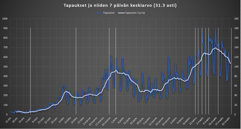 Lisäksi kannattaa huomioida HSL:n maskipakko, joka tuli voimaan 18.3, VR:llä hieman aiemmin (näille ei ole pystyviivaa).