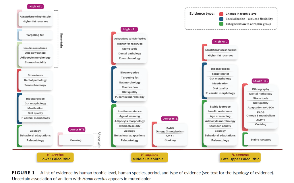 Vaikka kyseessä on vain yksi tutkimus, se on kerännyt materiaalia useammasta eri näkökulmasta, kuten yllä olevista kuvista näkyy. Tarkempia perusteluita löytyy itse tutkimuksesta lähteineen. Kuten tästä kuitenkin nähdään, ihminen sai parhaimmillaan yli 70 % kaloreista eläinperäisestä ruoasta, minkä perusteella ihminen voidaan määritellä hyperlihansyöjäksi (hypercarnivore). Tämä alkoi muuttua vasta myöhäispaleoliittisen kauden loppupuolella (kuvissa Late UP), noin 10000 – 20000 vuotta sitten. Tämä kehitys johtui erityisesti maanviljelyn alkamisesta, ja on myös esitetty hypoteeseja siitä, että suuria saaliseläimiä oli yhä vähemmän ja vähemmän, mikä johti kyseisenlaiseen tarpeeseen. Kyseinen ajanjakso osuu myös suunnilleen edellisen jääkauden loppumiseen, millä oli varmasti osuutensa maanviljelyn mahdollistajana. Tämän todistusaineiston perusteella ihminen oli kuitenkin hyperlihansyöjä vielä noin 20000 vuotta sitten, ja tämä kehitys lihansyöjäksi oli tapahtunut miljoonien vuosien evoluution kautta. Kasvien syönti on siis hyvin tuore keksintö ihmisen evoluution näkökulmasta.