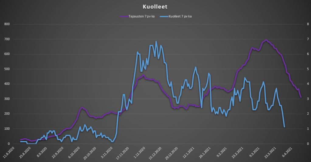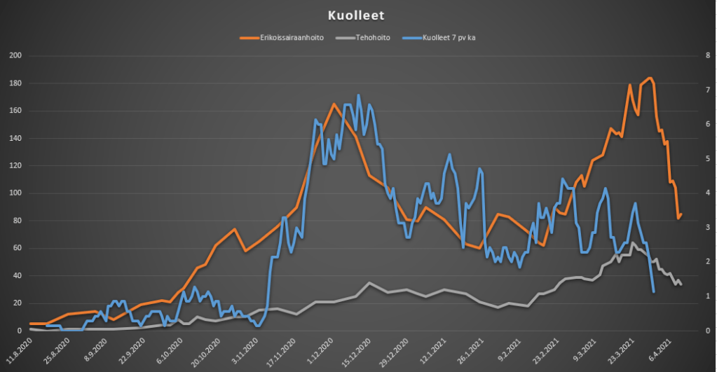 Kuten nähdään, viimeisen reilun kuukauden aikana tapahtunut piikki ei näy käytännössä mitenkään kuolleisuudessa, ja sen trendi on ollut alaspäin marras-joulukuun piikin jälkeen. Kuolleiden kuvaajassa ei ole viimeiset pari viikkoa mukana, sillä kuolemien rekisteröinnissä voi mennä pitkään ja se vääristäisi laskutrendiä (voi olla että viimeiset 4 viikkoa olisi pitänyt jättää tämän takia pois). Tartuntamäärien ensimmäinen piikki oli taas lokakuun lopussa, ja toinen maalis-huhtikuussa. Sairaalakuormitus on taas toisaalta mielenkiintoisempi: